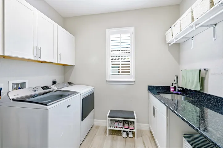 The spacious three car garage is fully equipped with air conditioning, an 8,000 lb two car hoist, insulated doors, and ample storage. The home includes a full house Generac generator with a 500 lb propane tank, impact rated doors and windows, and operates as a full smart home with Wi Fi and mobile control for the thermostat, pool, blinds, and garage doors.