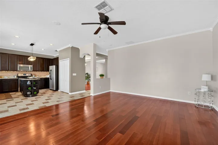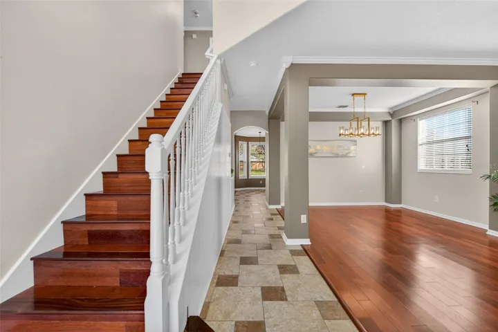 Upon entry, you’re welcomed by formal living and dining rooms that provide inviting spaces for family celebrations and special occasions. The house features tile and wood flooring throughout, along with crown molding.