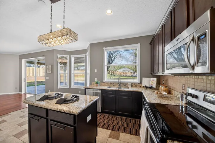 The kitchen has granite countertops, a center island with storage, a tiled backsplash, ample cabinet and counter space, and a spacious eat-in area. The open concept area then takes you to a spacious family room that faces the backyard.