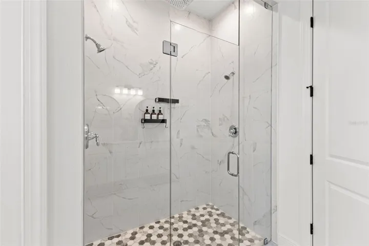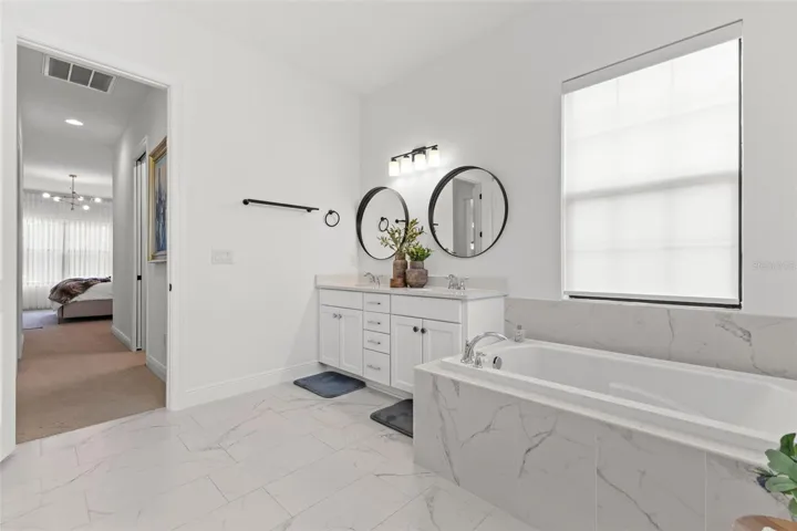 The primary suite is generously sized and features private access to the backyard, two large walk-in closets, and a well-appointed bathroom with marble tile, dual vanities, a walk-in shower, a soaking tub, and a separate water closet for added privacy.
