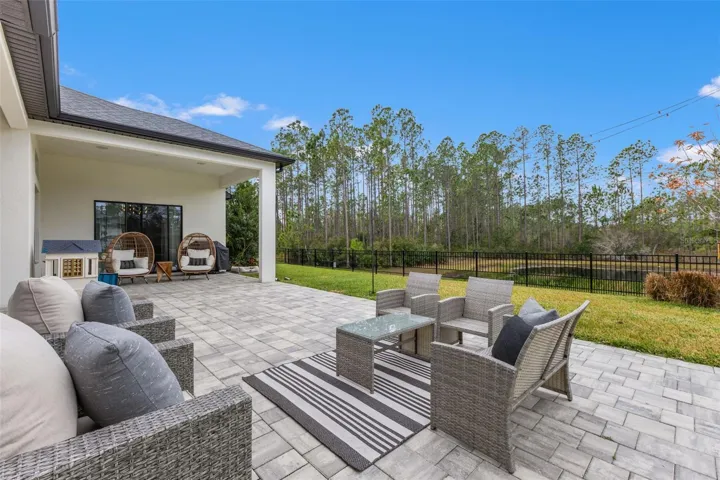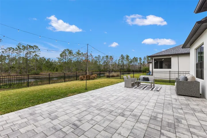 The backyard is a true highlight of the home, offering two covered porch areas, an oversized paver patio ideal for entertaining, and a fully fenced yard with ample space for a future pool. Pre-wired for pool installation and overlooking conservation and pond views, this outdoor space is designed for true Florida living.