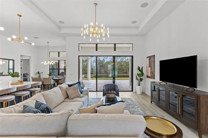 From the moment you enter the home opens into a bright and expansive living space where the living room, dining area, and kitchen flow seamlessly together. Oversized windows line the back of the home, filling the space with natural light and framing tranquil backyard views. Soaring 12-foot ceilings enhance the open feel, while the living room features tray ceilings that extend up to 13 feet, creating a striking focal point within the main gathering space. Modern brass light fixtures add a refined and contemporary touch throughout.