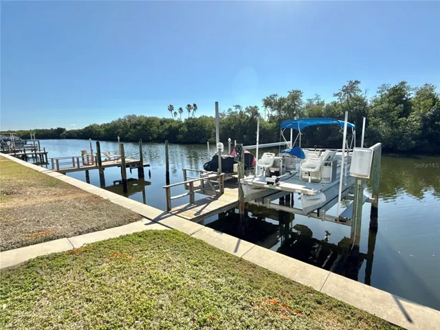 This fully furnished 2 bed/1.5 bath home with 40+ feet of waterfront comes with a dock and two lifts–8,000 pd boat lift and jet ski lift with barely used jet ski. The features are many: 2026 HVAC system (heat & air), primary bedroom with wall of closets has bath close by with walk-in shower and lots of storage. Guest bedroom suite has 1/2 bath. Large living area opens to kitchen and water views. 150 sq. ft enclosed porch adds to the living space. Two sheds for storage or boating equipment. Gas water heater. Washer and dryer hook up in shed. Bring your vision and remodel to fit your needs or use as a second home or investment property as renting is allowed with 2-month minimum. Home is located on wide saltwater canal with views of mangroves–no homes to look at. 2 pets (dogs or cats) up to 35 pounds are welcomed. Low monthly maintenance fee of $380 includes water/sewer/trash pick up/ lawn mowing/24 hr manned gate/private streets/seawall maintenance and all amenities including clubhouse, heated pool, fitness center, billiards and so much more! Americana Cove is a popular 55+ community located only 10 mins from downtown St. Petersburg, 20 mins to two airports and 3 mins to 4th Street shopping, dining and grocery. You’re in the hub of everything yet located in a serene beautiful community. No flooding from 2024 storms! Great value for waterfront property!